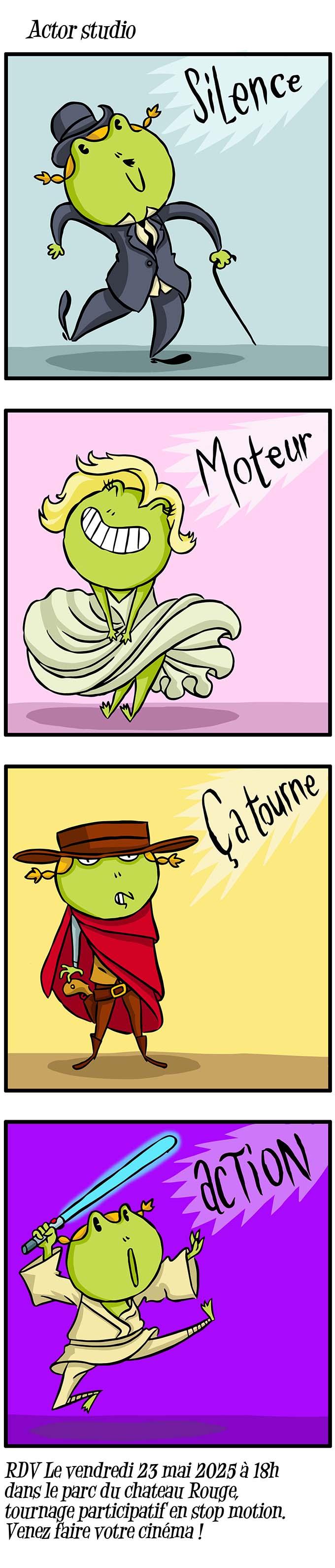 Mai 2025 Aujourd'hui, la joyeuse troupe participe à un tournage, la classe ! Tu as envie de faire comme elle ? Va dans le parc du château Rouge vendredi soir ! Le vent du Riatt y propose un tournage participatif en stop motion ! Zoom sur l'image Le Côa Club Tous les strips du Côa Club