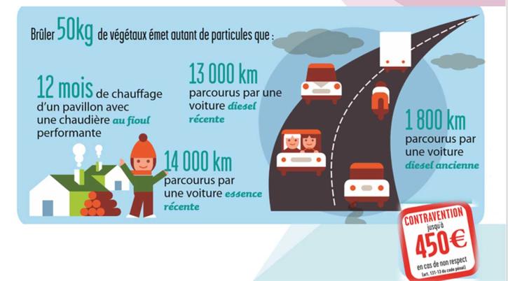 Si vous souhaitez plus de détails sur les polluants émis par le brûlage, sachez que ces feux ne sont pas seulement sources de particules ; en les comparant aux émissions de la circulation urbaine, il a été montré que brûler 50 kg de déchets verts équivaut à émettre :