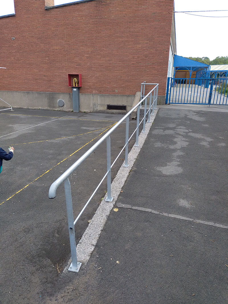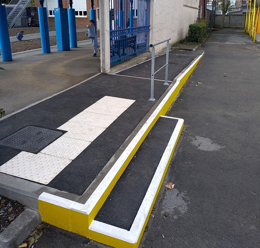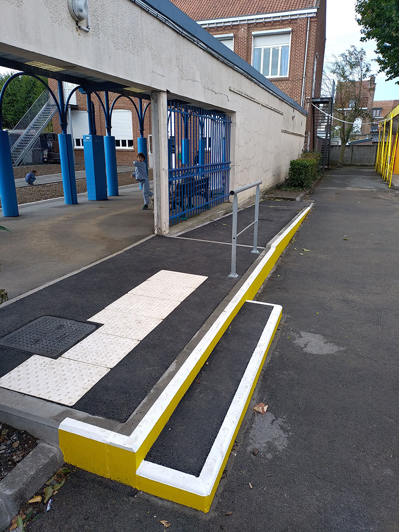 Dans le premier, une rampe PMR a été aménagée à la jonction entre les deux cours (photo 1). Les services techniques en ont aussi profité pour sécuriser une autre rampe déjà existante avec un garde-corps (photo 2).