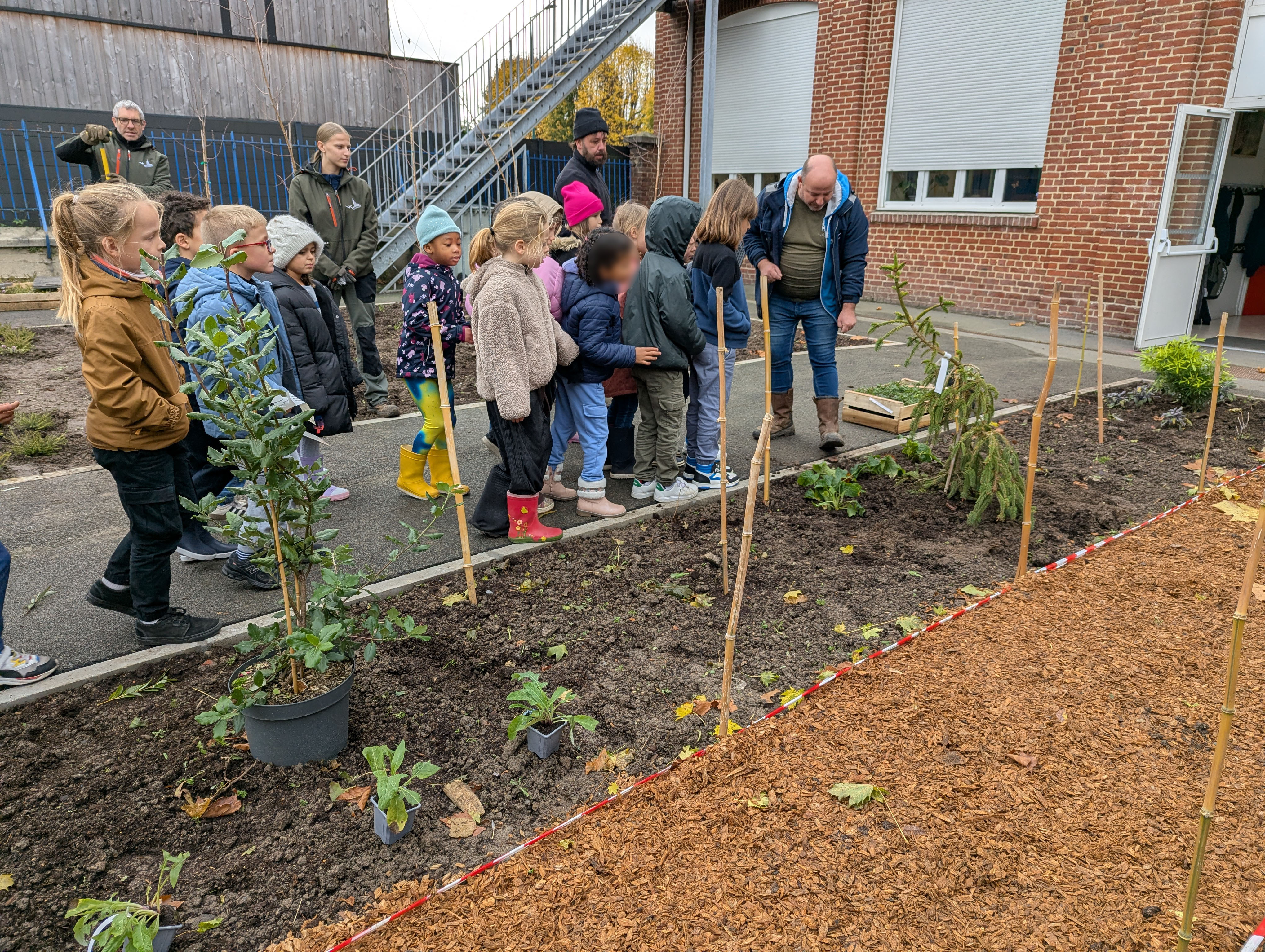Ce projet de longue haleine -les travaux de terrassement ont débuté cet été- est, en ce lundi 3 novembre, en train de prendre forme : la cour bruisse de mille voix enthousiastes. Sons d'une récréation ordinaire ? Pas vraiment : les enfants, tous en bottes et petites pelles à la main, s'apprêtent à planter selon le plan qu'ils ont choisi, les plantes et arbustes qui composeront leur future cour.