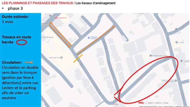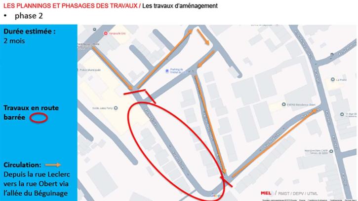 Ces deux mois (hors aléas climatiques) seront consacrés à la 2ème phase portant sur la portion située entre le parking arrière de la Mairie et l’allée du Béguinage. La circulation sera alors maintenue depuis la rue du Général Leclerc vers la rue Obert via l’allée du Béguinage.