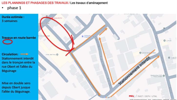 La 1ère phase concerne la portion d’entrée dans la rue des Écoles par la rue du Général Leclerc. Le stationnement est interdit sur le tronçon entre l’allée du Béguinage et la rue Obert pour permettre la mise en double sens de circulation depuis la rue Obert jusque l’allée du Béguinage.
