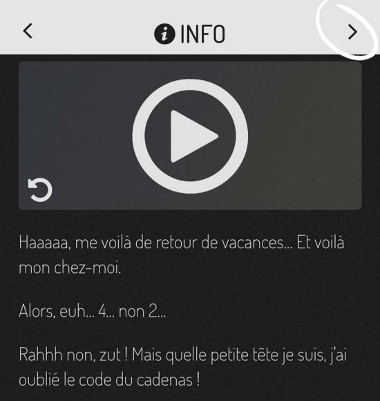 > Si malencontreusement vous revenez sur une page précédente, il suffit d’appuyer sur la flèche en haut à droite pour revenir à l’énigme en cours (voir photo).