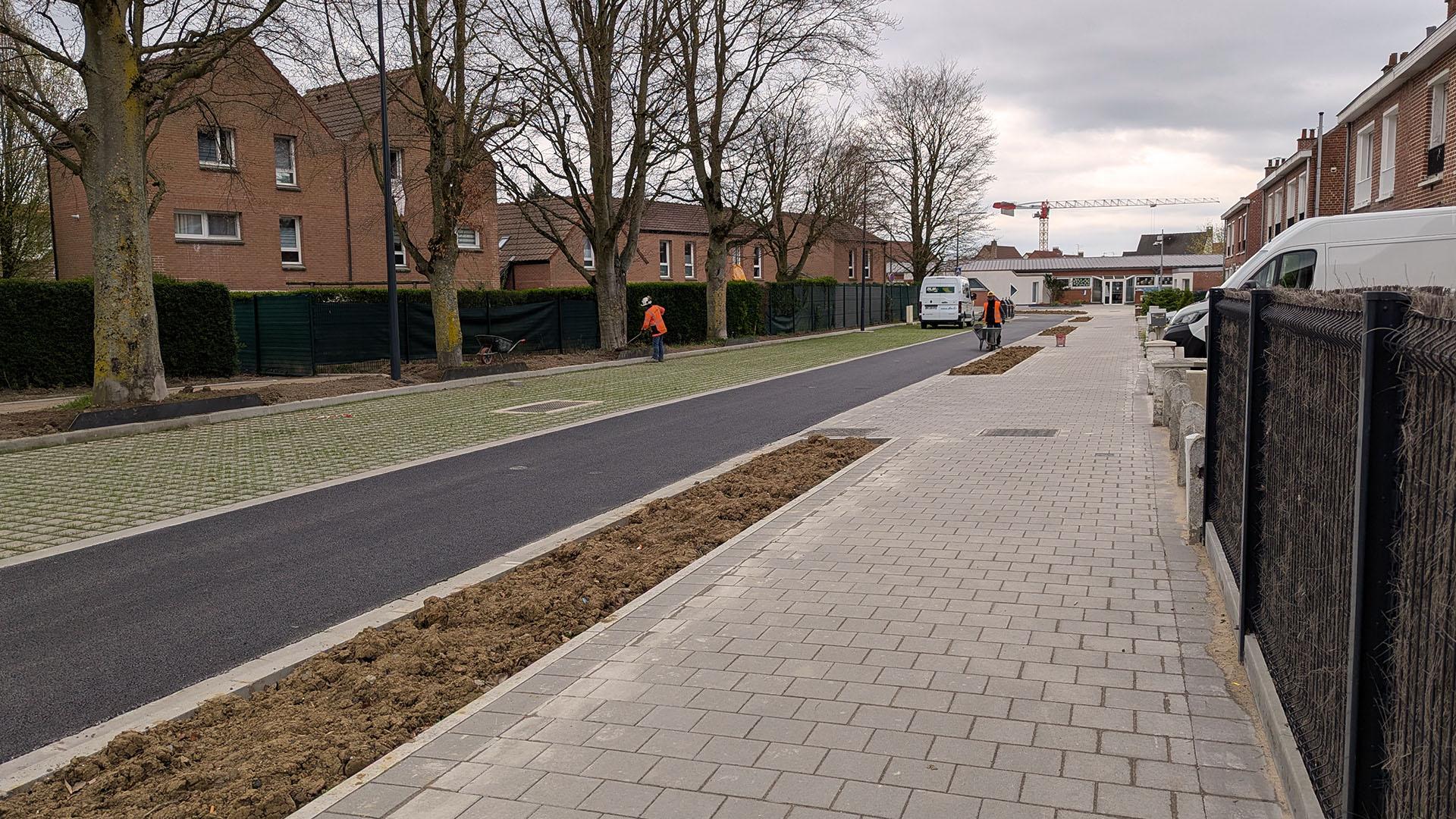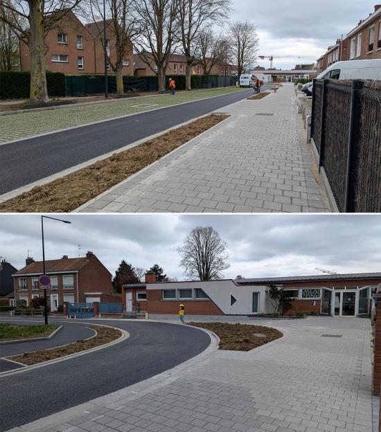 Des massifs végétalisés vont accompagner la rue, tandis que des parkings perméables permettent une gestion plus naturelle des eaux de pluie. Les points d’apport volontaire enterrés remplacent les bacs individuels et vont contribuer ainsi à un espace public plus propre et mieux organisé.